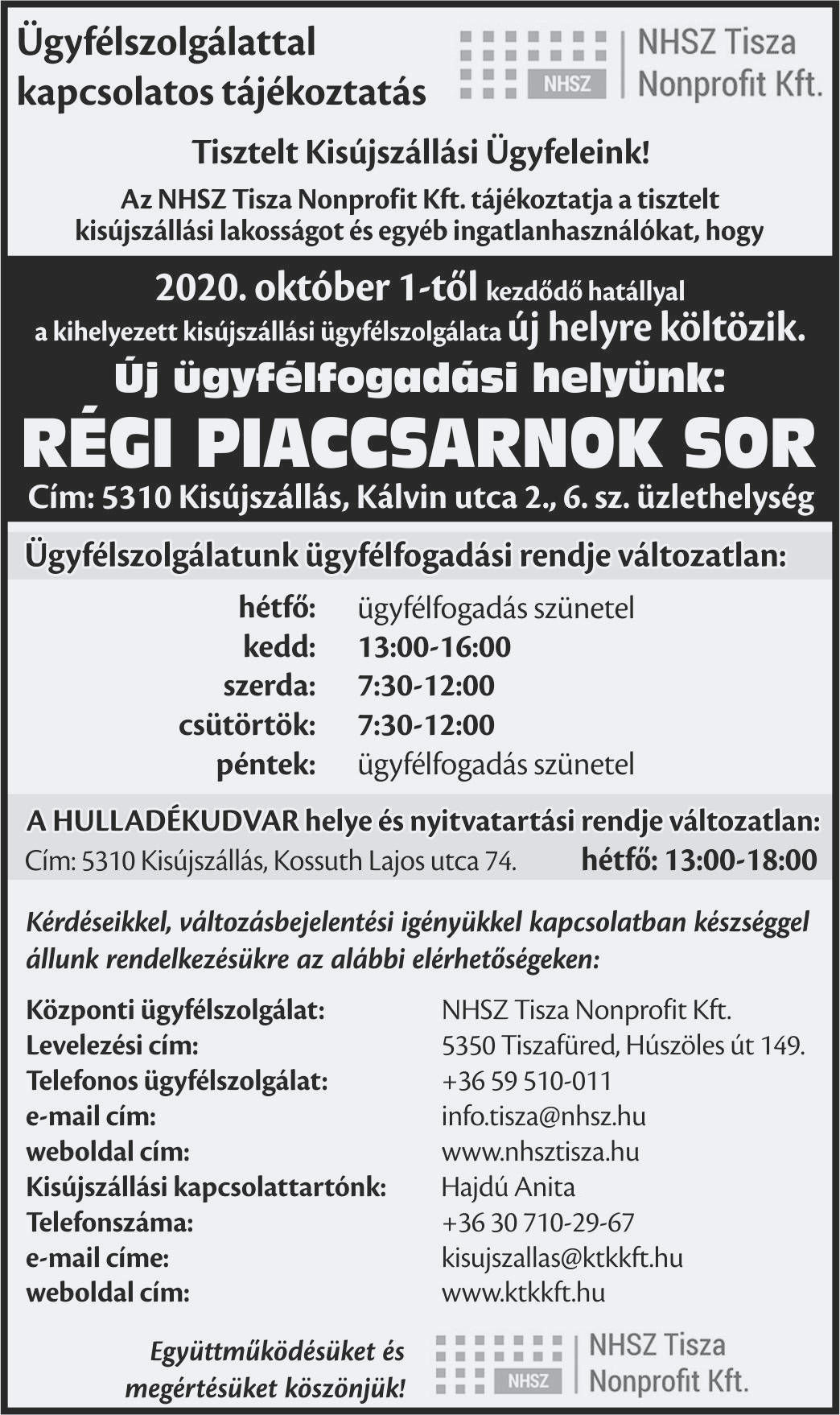 Ügyfélszolgálati iroda új helyen 2020. október 1-től