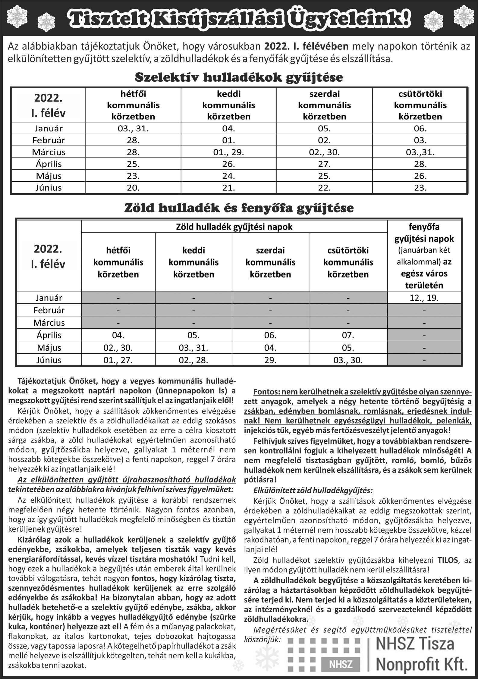 Szelektív-, zöldhulladék és fenyőfa gyűjtés 2022 - 1. félév