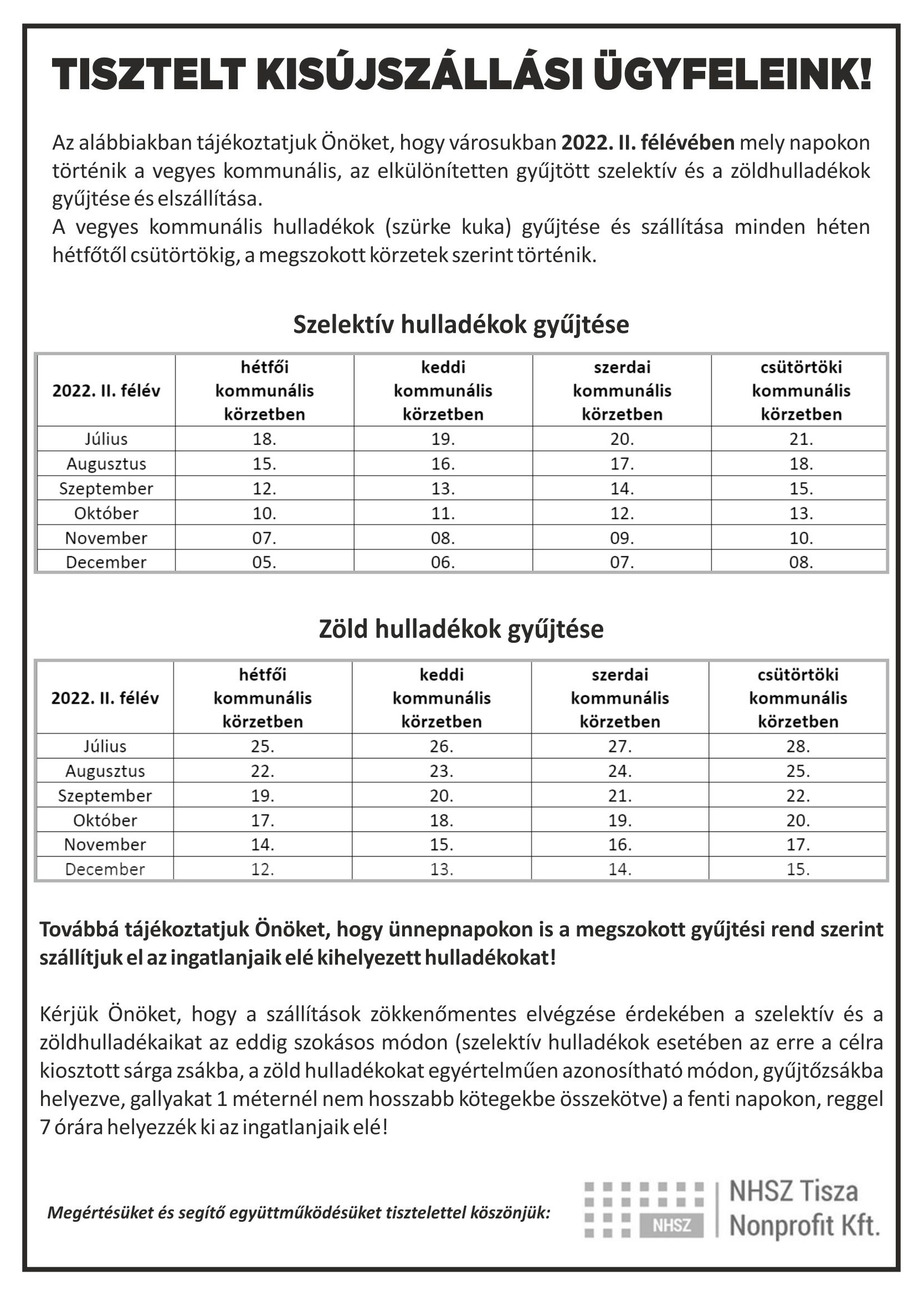 Szelektív-, zöld- és kommunális hulladék 2022 - 2. félév
