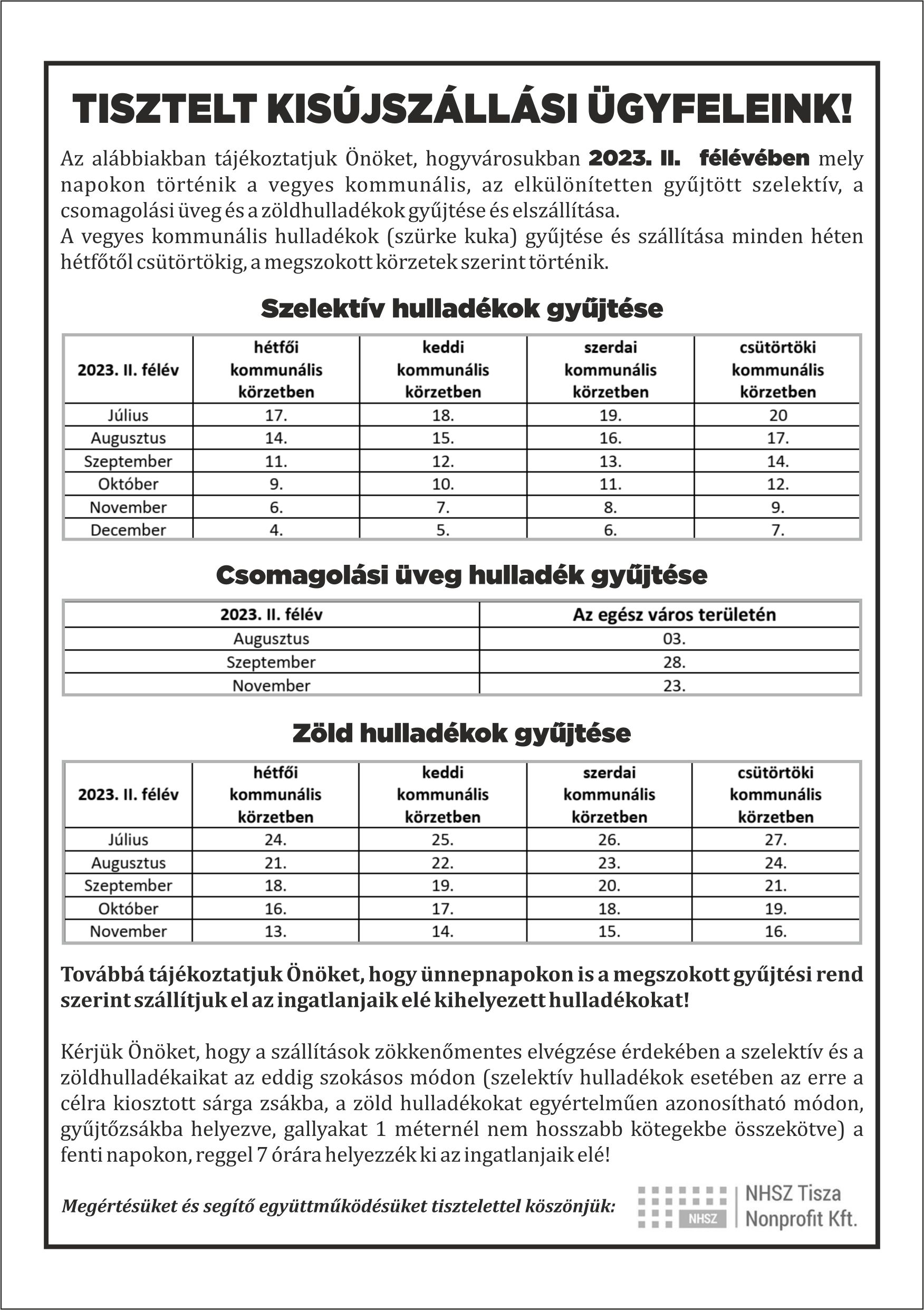 Szelektív-, zöld- és csomagolási üveg hulladék gyűjtés 2023 - 2. félév