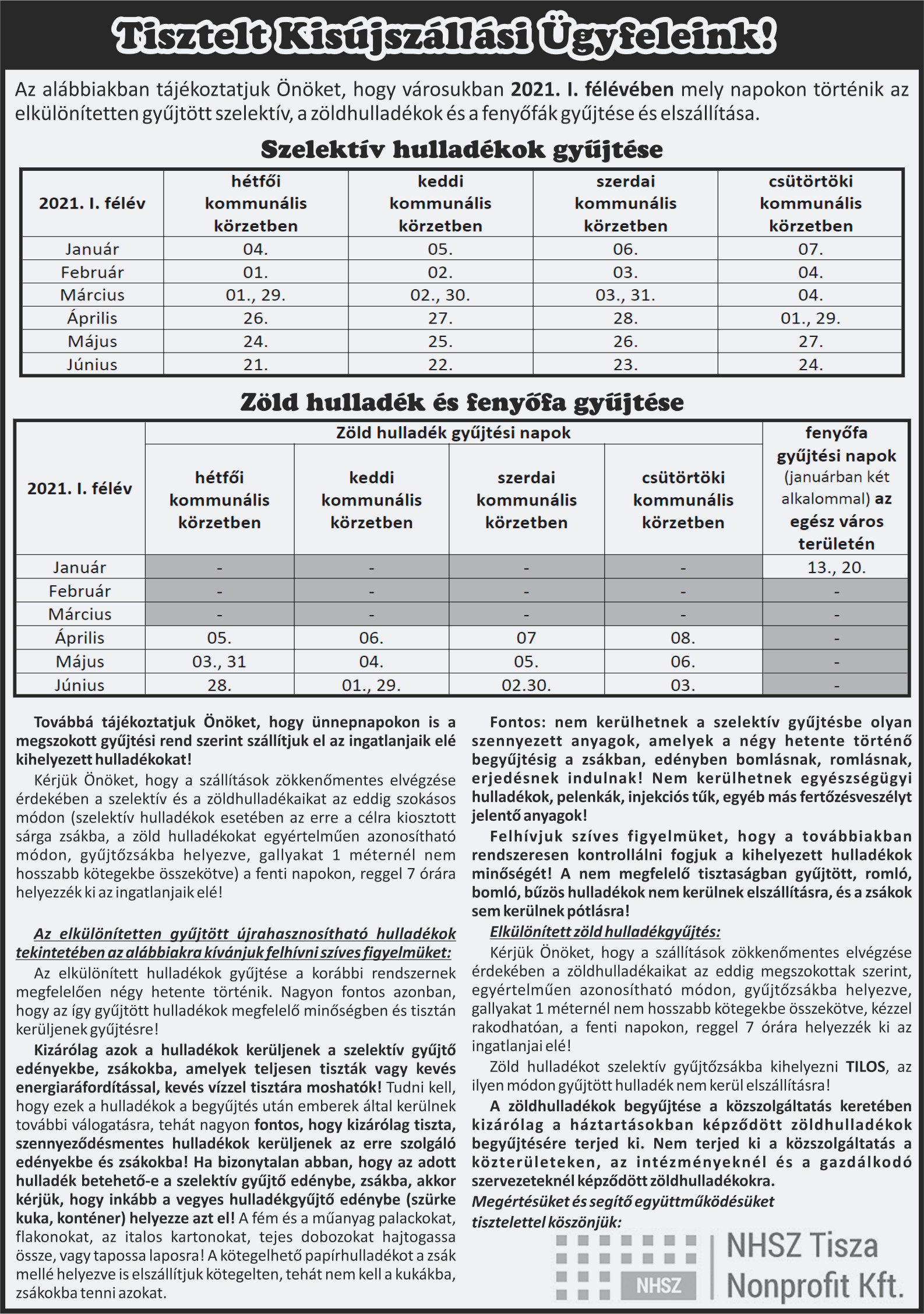 Szelektív-, zöldhulladék és fenyőfa gyűjtés 2021 - 1. félév