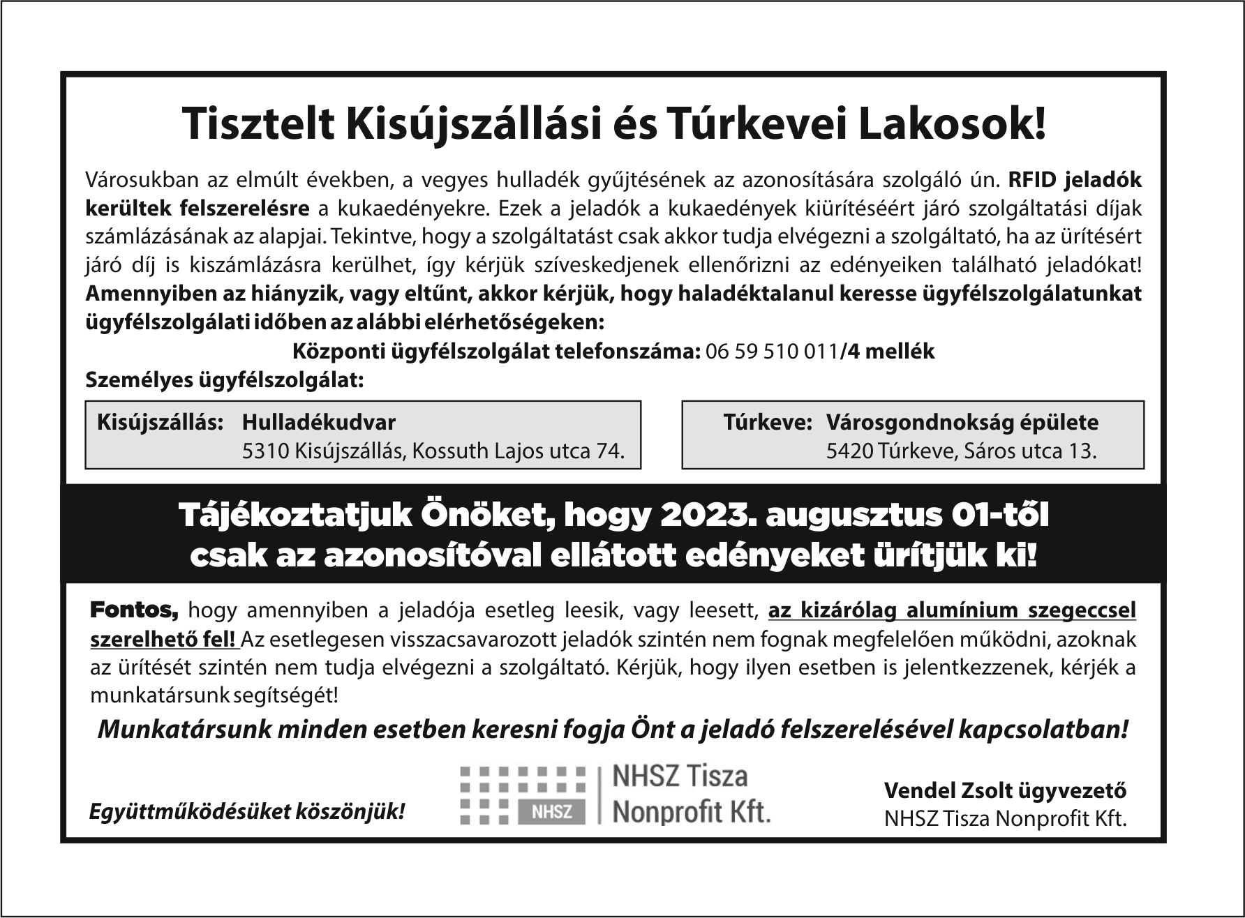 Tájékoztatjuk Önöket, hogy 2023. augusztus 1-től csak az azonosítóval ellátott edényeket ürítjük ki!